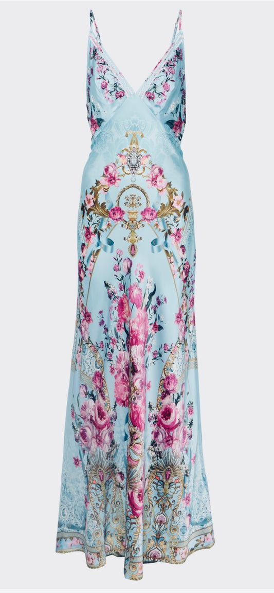 Camilla Embellished Blue Floral Silk Slip Maxi Dress