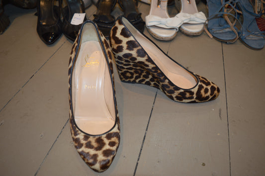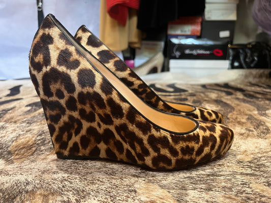 Louboutin Melissa Leopard Pony Hair Round Toe Wedge Shoes