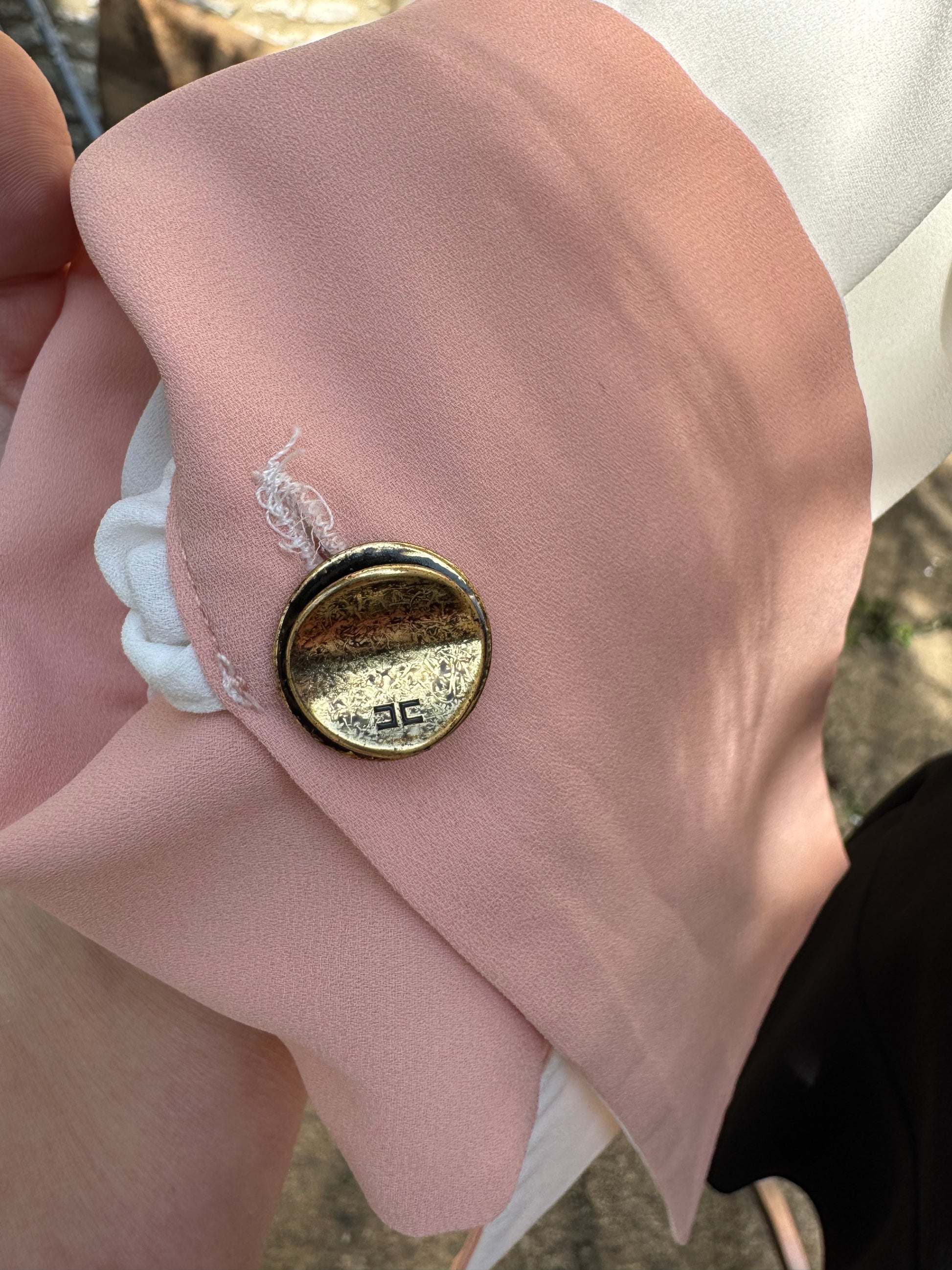 A superb divisible mini dress in contrasting blush white and black. The dress features two parts a blouse with neck and cuff ribbons and sexy backless feature and a mini skirt with wavy hem which join together with internal buttons giving this seasonal and styling versatility. The dress is labelled a European size 40. Which is a UK 10-12. Shown on a size 8 mannequin without any clips…