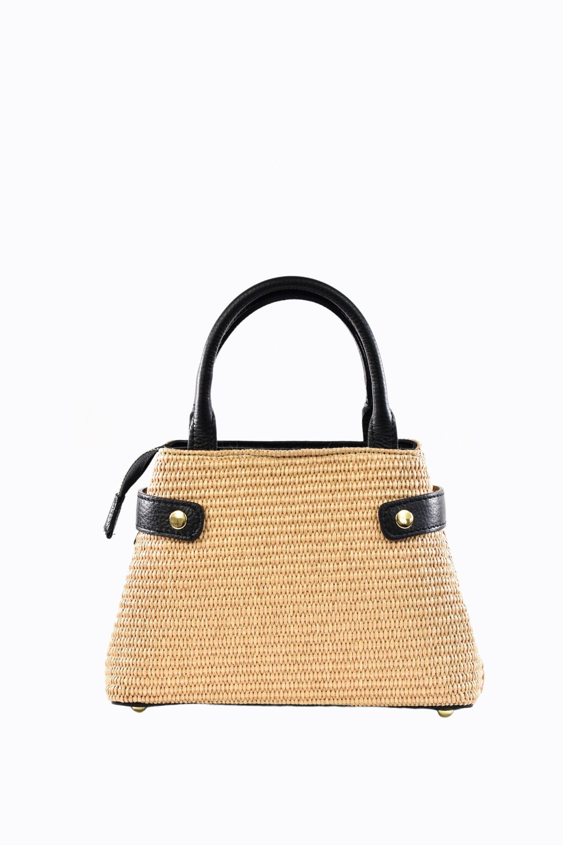 A Bag in Genuine Calf Leather and handwoven Raffia, Made in Italy, with gold hardware. The interior features a main compartment with a side zippered pocket, and two additional side pockets for documents/cell phones. A really charming and easy to wear bag for day and evening wear.