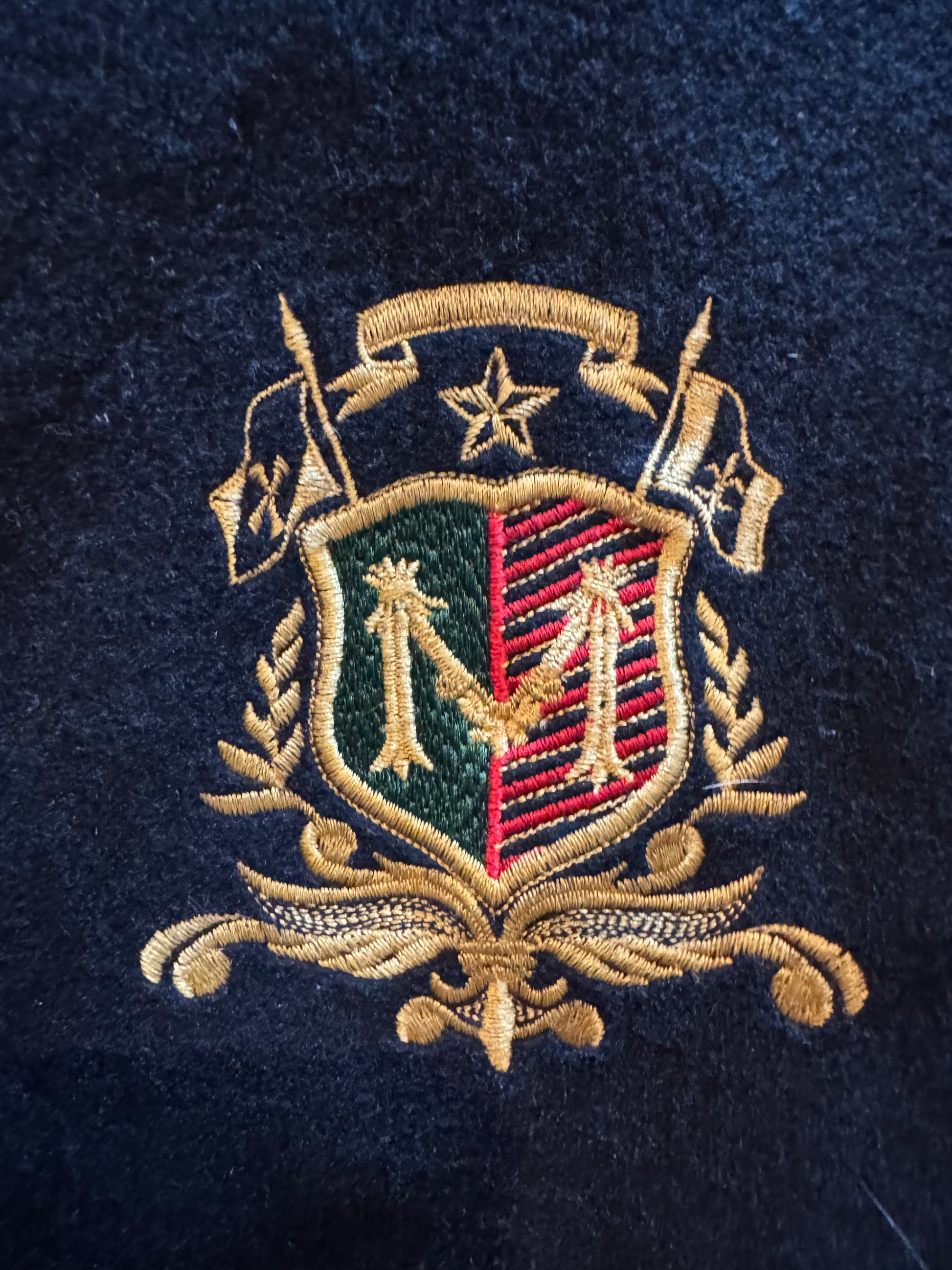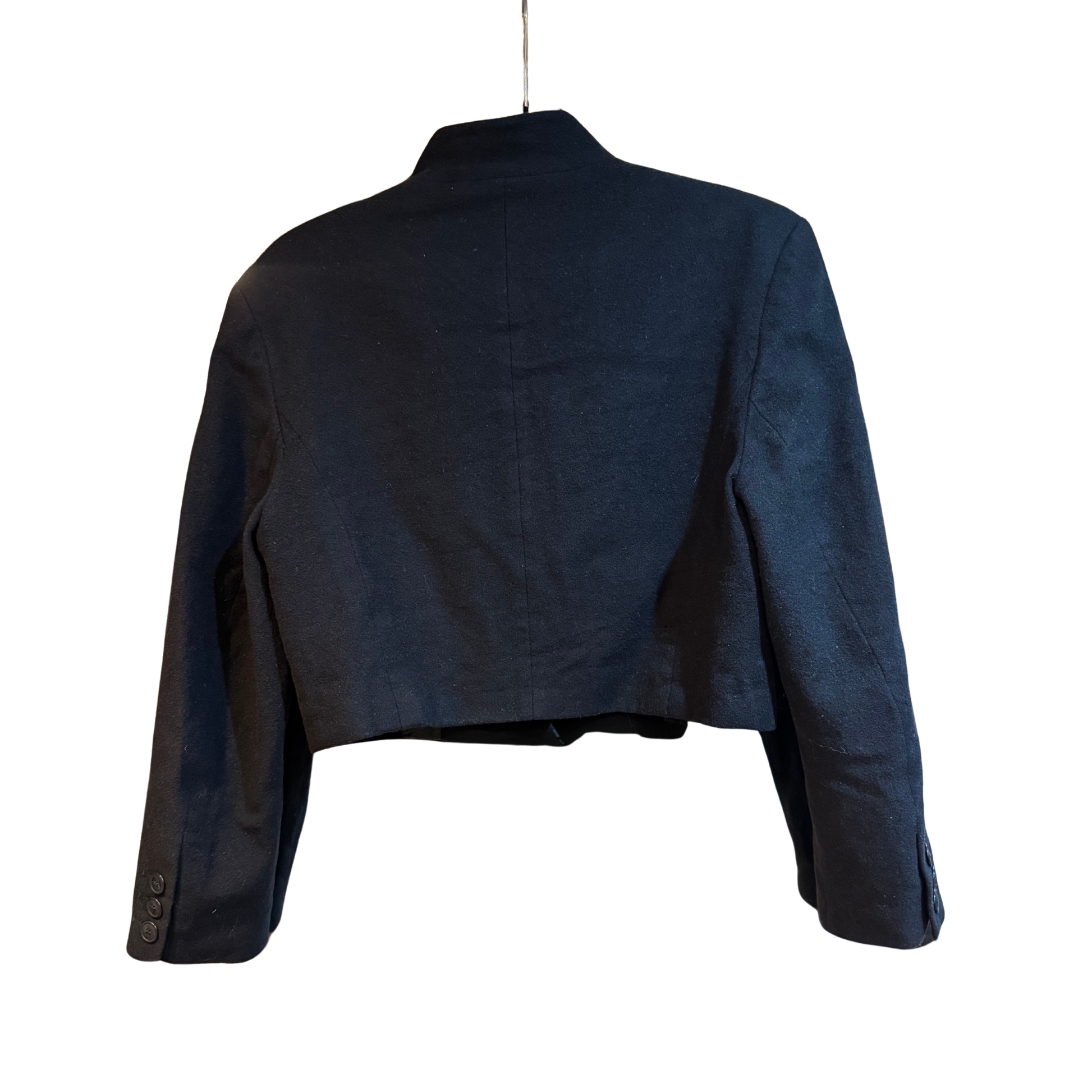 Mondi black wool military style wool cropped lined jacket with 4 coats of arms. Missing one button so reduced price. Size 8-10.