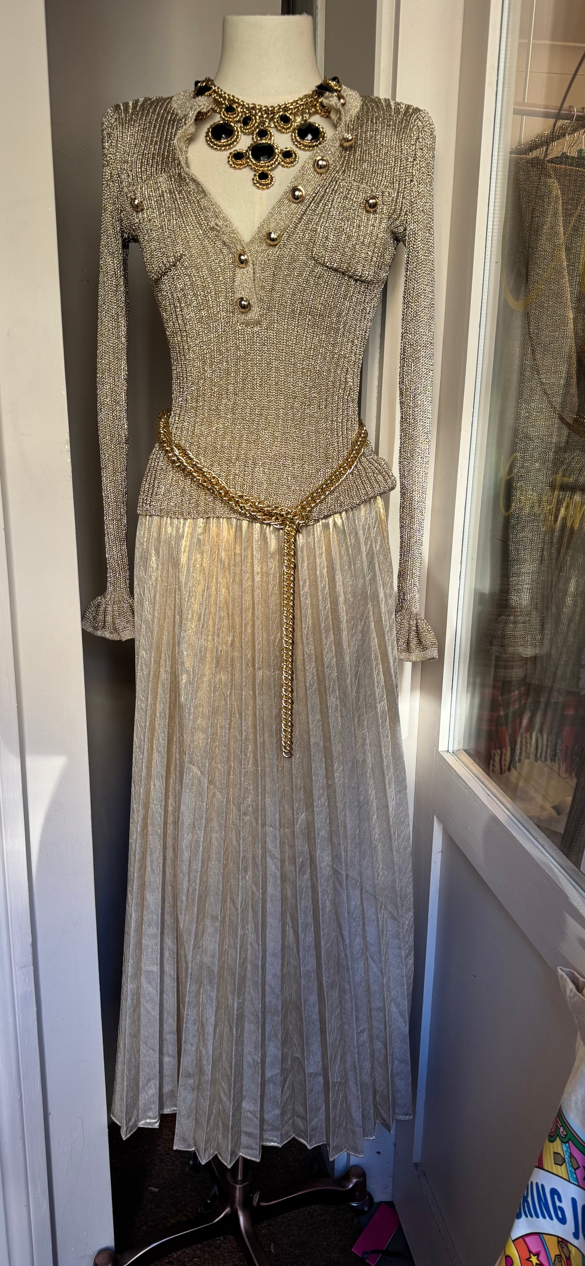 Immaculate condition, unworn, comes with gold chain belt. On their website still at £550. Size small, suit a 6-8 or petite 10. Floor length on 5ft 5 but will sit above ankles on height over 5 ft 7-8. Elegant iridescent gold gently pleated skirt and soft stretchy gold thread lurex top, slim elastic waistband on skirt, almost comes as separates. Flared cuff. Gorgeous.
