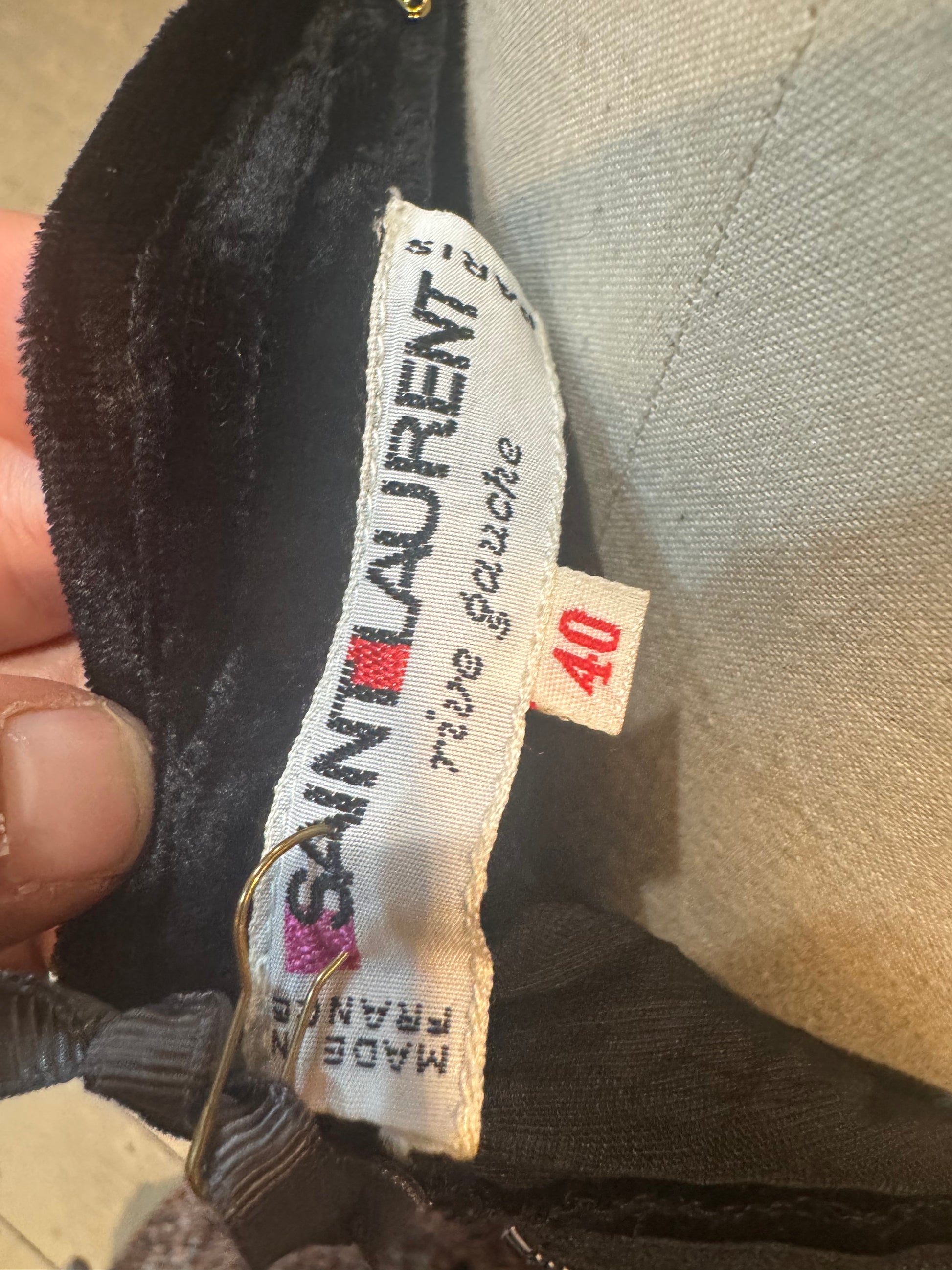 A luxurious vintage Yves Saint Laurent skirt in deep black crushed velvet — rich, tactile, and beautifully cut. The fluid pleats fall from a structured waistband, creating soft movement and an elongated silhouette.