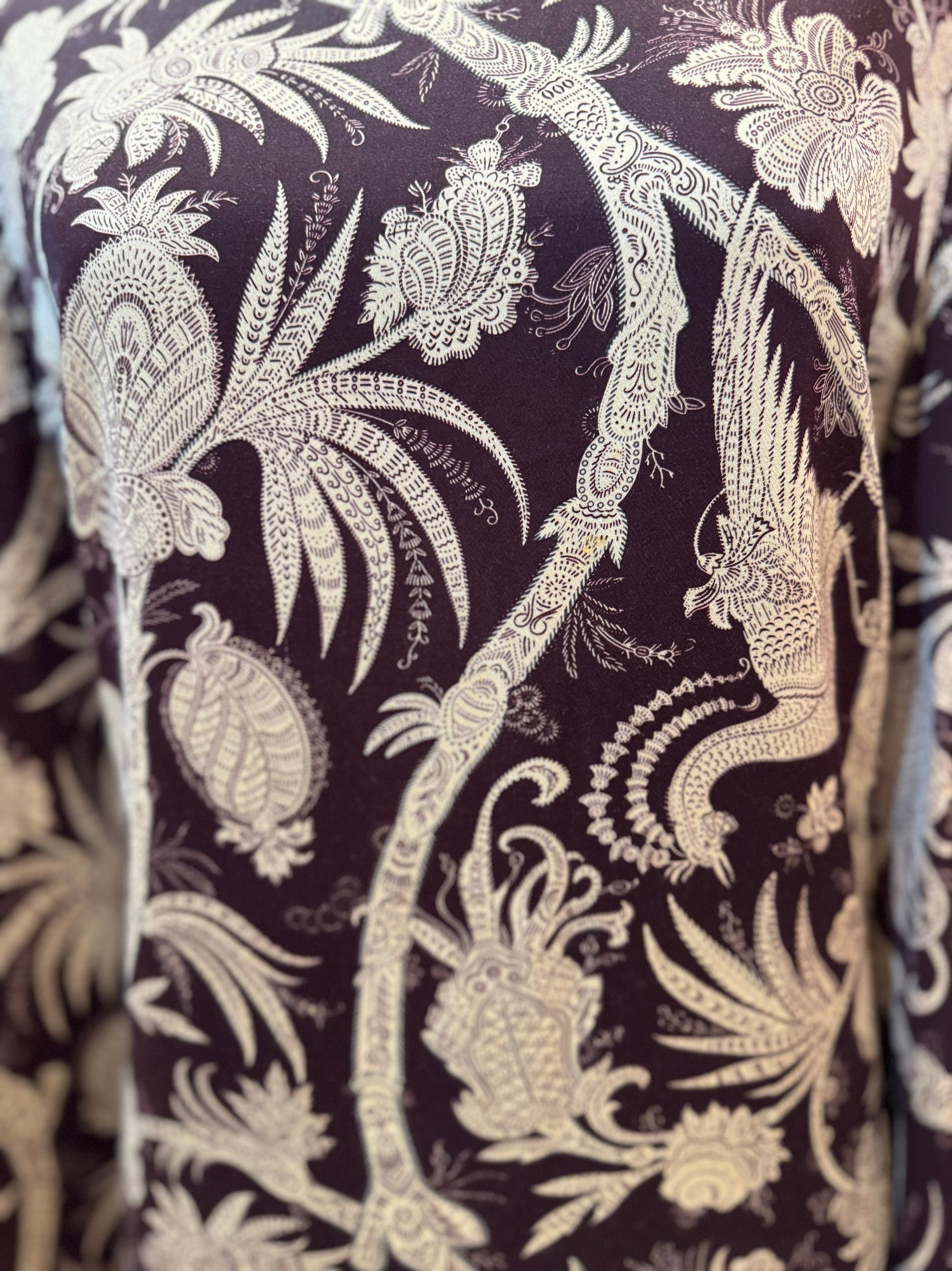 Featuring a lovely floral paisley print with relaxed long sleeves, in beige and plum. Made of a viscose the dress has a silk feel and slight sheen. Elegant tunic dress. Size 1 which is a UK size 8.